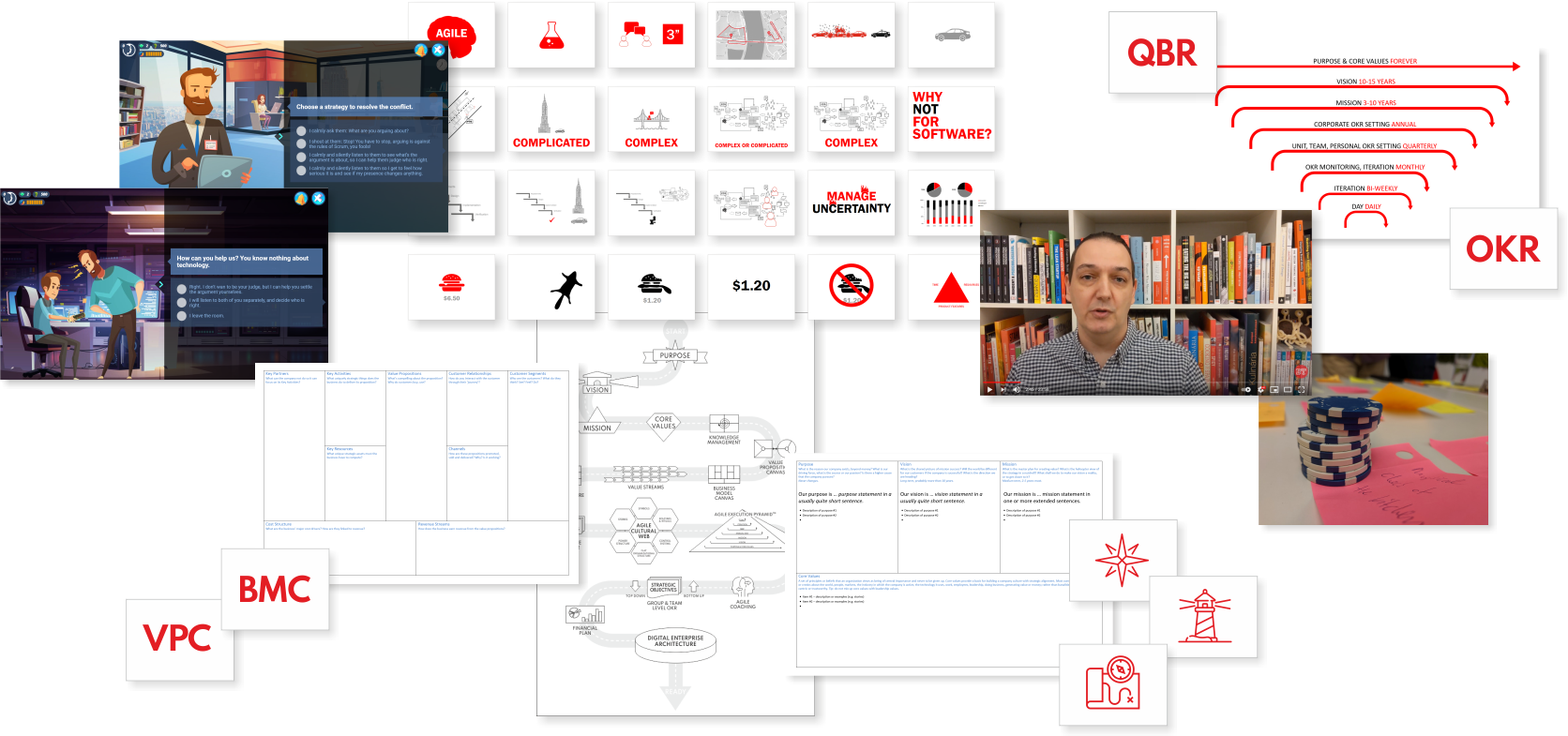 We prefer teaching by doing, so we facilitate events, hold hands-on workshops and run custom transforamtion programs. We prepare you to apply the right mindset, theories, disciplines, principles, frameworks, methods and tools. We teach your team the building blocks of the Digital Readiness Framework combining traditional expert led and economical digital learning.