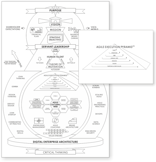 Agile Execution builds on the foundation of human talent and motivation: fostering self-management with coaching oriented servant leadership and inspection and adaptation in different, gradually decreasing time-boxes. Objectives and Key Resultr or OKRs provide strategic alignement to employees of all levels.